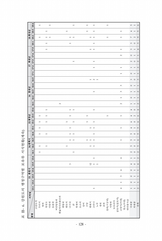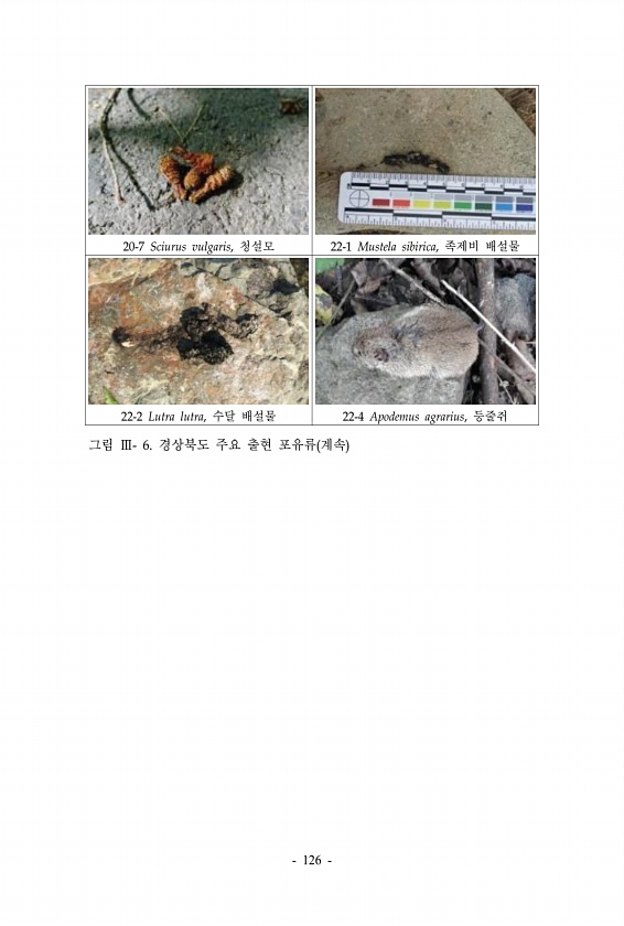 20-7 Sciurus vulgaris, 청설모 22-1 Mustela sibirica, 족제비 배설물 22-2 Lutra lutra, 수달 배설물 22-4 Apodemus agrarius, 등줄쥐 그림 Ⅲ- 6. 경상북도 주요 출현 포유류 계속 126