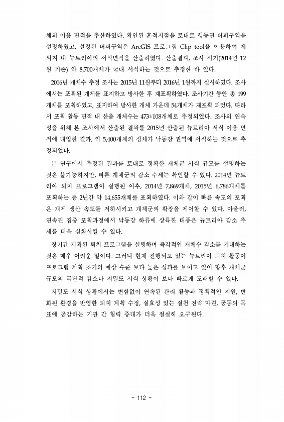 체의 이용 면적을 추산하였다. 확인된 흔적지점을 토대로 행동권 버퍼구역을 설정하였고, 설정된 버퍼구역은 ArcGIS 프로그램 Clip tool을 이용하여 제 외지 내 뉴트리아의 서식면적을 산출하였다. 산출결과, 조사 시기 2014년 12 월 기존 약 8,700개체가 국내 서식하는 것으로 추정한 바 있다. 2016년 개체수 추정 조사는 2015년 11월부터 2016년 1월까지 실시하였다. 조사 에서는 포획된 개체를 표지하고 방사한 후 재포획하였다. 조사기간 동안 총 199 개체를 포획하였고, 표지하여 방사한 개체 가운데 54개체가 재포획 되었다. 따라 서 포획 활동 면적 내 산출 개체수는 473±108개체로 추정되었다. 조사의 연속 성을 위해 본 조사에서 산출된 결과를 2015년 산출된 뉴트리아 서식 이용 면...