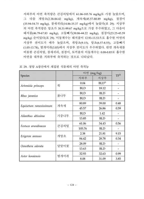 124 61.06-105.76 mg/kg , 2.38-84.42 mg/kg , 45.57-80.89 mg/kg , 35.94-54.75 mg/kg , 14.86-35.37 mg/kg 29 30.31-99.67 mg/kg , 46.79-67.83 mg/kg , 30.86-44.22 mg/kg , 23.25-45.59 mg/kg 29 12.93-13.53 , 9.15 , 6.57-8.55 , 1.05-13.78 , 3.85 , , , 0.08-0.85 Species mg/kg TF2 Artemisia princeps 0.04 BLD1 BLD 18.12 Rhus javanica BLD BLD BLD BLD Equisetum ramosissimum 80.89 39.00 0.48 45.57 26.86 0.59 Ail...