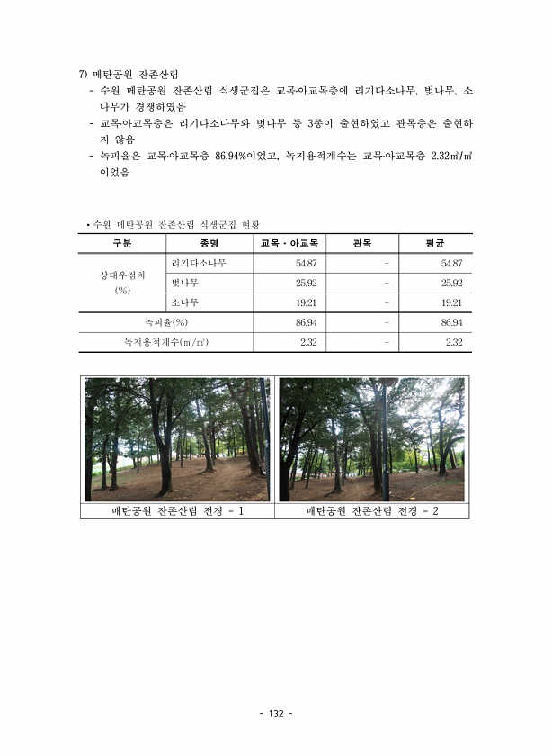 132 7 메탄공원 잔존산림 수원 메탄공원 잔존산림 식생군집은 교목?아교목층에 리기다소나무, 벚나무, 소 나무가 경쟁하였음 교목?아교목층은 리기다소나무와 벚나무 등 3종이 출현하였고 관목층은 출현하 지 않음 녹피율은 교목?아교목층 86.94%이었고, 녹지용적계수는 교목?아교목층 2.32㎥/㎡ 이었음 ?수원 메탄공원 잔존산림 식생군집 현황 구분 종명 교목?아교목 관목 평균 상대우점치 % 리기다소나무 54.87 54.87 벚나무 25.92 25.92 소나무 19.21 19.21 녹피율 % 86.94 86.94 녹?땶띁?㎥/㎡ 2.j2 2.j2 매탄공원 잔존산림 전경 1 매탄공원 잔존산림 전경2