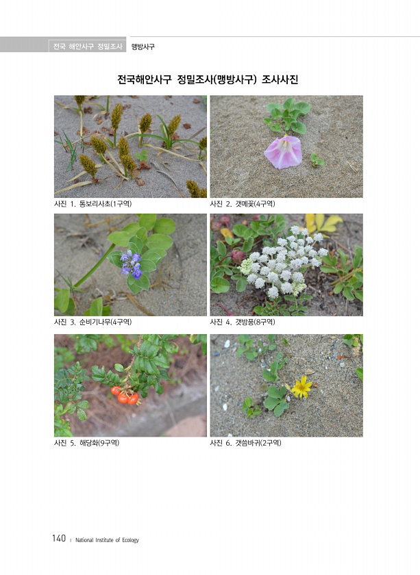 전국 해안사구 정밀조사 맹방사구 140 ? National Institute of Ecology 전국해안사구 정밀조사 맹방사구 조사사진 사진 1. 통보리사초 1구역 사진 2. 갯메꽃 4구역 사진 3. 순비기나무 4구역 사진 4. 갯방풍 8구역 사진 5. 해당화 9구역 사진 6. 갯씀바귀 2구역