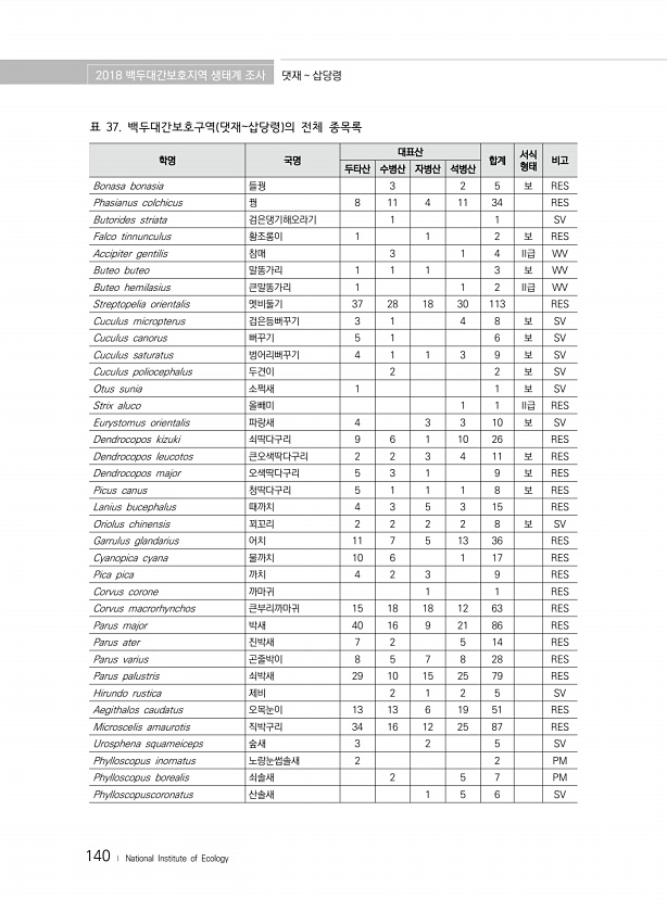 2018 백두대간보호지역 생태계 조사 댓재 삽당령 140 ? National Institute of Ecology 학명 국명 대표산 합계 서식 두타산 수병산 자병산 석병산 형태 비고 Bonasa bonasia 들꿩 3 2 5 보 RES Phasianus colchicus 꿩 8 11 4 11 34 RES Butorides striata 검은댕기해오라기 1 1 SV Falco tinnunculus 황조롱이 1 1 2 보 RES Accipiter gentilis 참매 3 1 4 II급 WV Buteo buteo 말똥가리 1 1 1 3 보 WV Buteo hemilasius 큰말똥가리 1 1 2 II급 WV Streptopelia orientalis 멧비둘기 37 28 18 30 113 RES Cuculus mi...