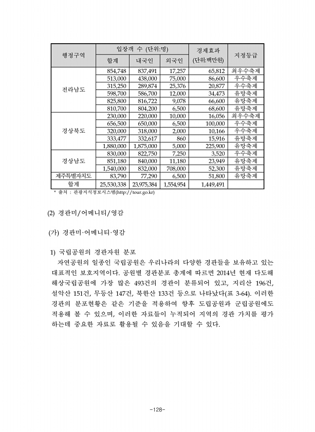 -128- 행정구역 입장객 수 단위 명 경제효과 합계 내국인 외국인 단위 백만원 지정등급 전라남도 최우수축제 우수축제 우수축제 유망축제 유망축제 유망축제 경상북도 최우수축제 우수축제 우수축제 유망축제 유망축제 경상남도 우수축제 유망축제 유망축제 제주특별자치도 유망축제 합계 출처 관광지식정보시스템 경관미 어메니티 영감 가 경관미 어메니티 영감 국립공원의 경관자원 분포 자연공원의 일종인 국립공원은 우리나라의 다양한 경관들을 보유하고 있는 대표적인 보호지역이다 공원별 경관분포 총계에 따르면 년 현재 다도해 해상국립공원에 가장 많은 건의 경관이 분류되어 있고 지리산 건 설악산 건 무등산 건 북한산 건 등으로 나타났다 표 이러한 경관의 분포현황은 같은 기준을 적용하여 향후 도립공원과 군립공원에도 적용해 볼 수 있으며...