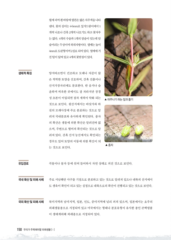 150 우리가 주목해야할 외래생물 [Ⅰ] 월에 피며 흰 바탕에 열편은 엷은 자주색을 나타 낸다. 꽃의 길이는 4-6mm로 잎겨드랑이에서 1 개씩 나오나 간혹 2개씩 나오기도 하고 꽃자루 는 없다. 4개의 수술과 1개의 암술이 잇는데 암 술머리는 두상이며 하위자방이다. 열매는 높이 4mm로 도란형이며 2실로 되어 있다. 열매에 거 친 털이 덮여 있고 4개의 꽃받침이 있다. 생태적 특징 양지바르면서 건조하고 모래나 자갈이 많 은 척박한 토양을 선호하며, 간혹 진흙이나 산지가장자리에도 분포한다. 반 음지나 습 윤하며 비옥한 곳에서도 잘 자라지만 장경 성 초본이 이입되면 점차 세력이 약화 되는 것으로 보인다. 원산지에서는 바닷가와 하 천의 모래사장에 주로 분포하는 것으로 알 려져 국내분포와 유사하게 확인된다. 종자...