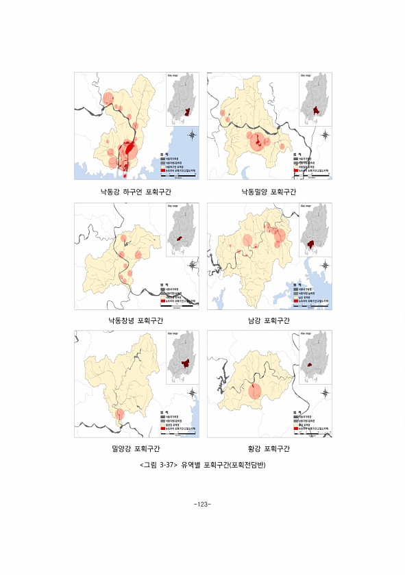 -123- 낙동강 하구언 포획구간 낙동밀양 포획구간 낙동창녕 포획구간 남강 포획구간 밀양강 포획구간 황강 포획구간 그림 3-37 유역별 포획구간 포획전담반