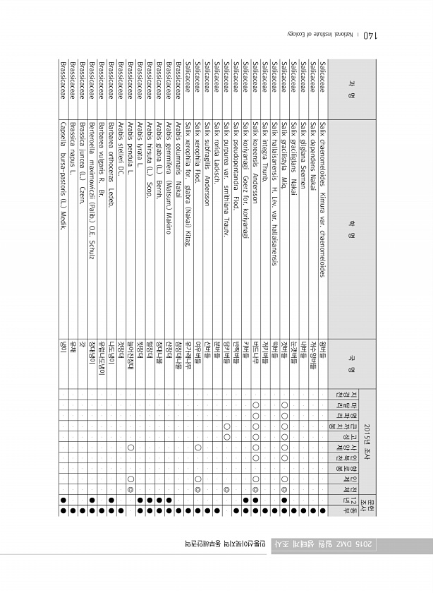 140 과 명 학 명 국 명 2015년 조사 문헌 조사 지경천 마달리 명파리 큰까치봉 고성 사양제 인북천 향로봉 인제 전체 12 년 동부 Salicaceae Salix chaenomeloides Kimura var. chaenomeloides 왕버들 ● Salicaceae Salix dependens Nakai 개수양버들 ● Salicaceae Salix gilgiana Seemen 내버들 ● Salicaceae Salix graciliglans Nakai 눈갯버들 ● Salicaceae Salix gracilistyla Miq. 갯버들 ? ? ? ...