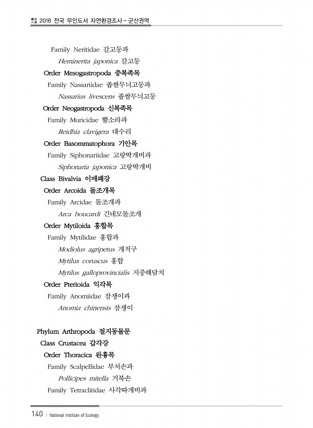 2016 전국 무인도서 자연환경조사 군산권역 140 ? National Institute of Ecology Family Neritidae 갈고둥과 Heminerita japonica 갈고둥 Order Mesogastropoda 중복족목 Family Nassariidae 좁쌀무늬고둥과 Nassarius livescens 좁쌀무늬고둥 Order Neogastropoda 신복족목 Family Muricidae 뿔소라과 Reidhia clavigera 대수리 Order Basommatophora 기안목 Family Siphonariidae 고랑딱개비과 Siphonaria japonica 고랑딱개비 Class Bivalvia 이매패강 Order Arcoida 돌조개목 Family Arcidae 돌조개과 Arca b...