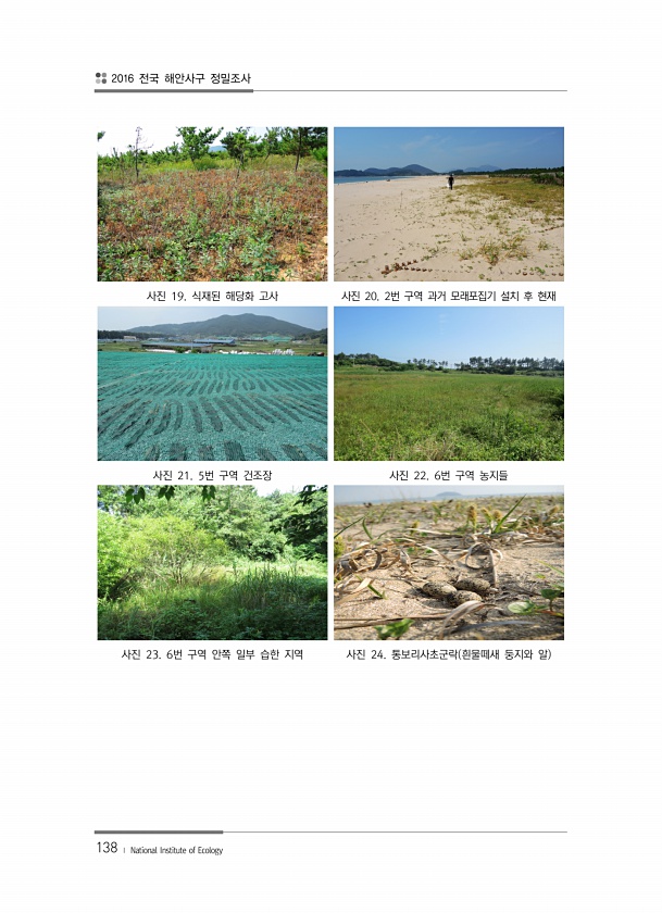 2016 전국 해안사구 정밀조사 138 ? National Institute of Ecology 사진 19. 식재된 해당화 고사 사진 20. 2번 구역 과거 모래포집기 설치 후 현재 사진 21. 5번 구역 건조장 사진 22. 6번 구역 농지들 사진 23. 6번 구역 안쪽 일부 습한 지역 사진 24. 통보리사초군락 흰물떼새 둥지와 알