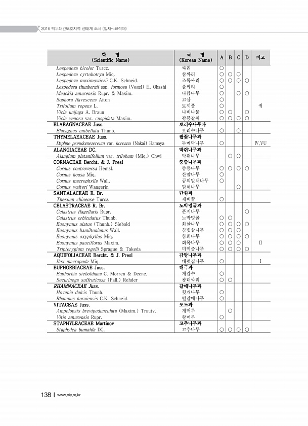 2016 백두대간보호지역 생태계 조사 밀재묘적재 138Ⅰwww.nie.re.kr 학 명 Scientific Name 국 명 Korean Name A B C D 비고 Lespedeza bicolor Turcz. 싸리 ○ Lespedeza cyrtobotrya Miq. 참싸리 ○ ○ ○ Lespedeza maximowiczii C.K. Schneid. 조록싸리 ○ ○ ○ ○ Lespedeza thunbergii ssp. formosa Vogel H. Ohashi 풀싸리 ○ Maackia amurensis Rupr. & Maxim. 다릅나무 ○ ○ ○ Sophora flavescens Aiton 고삼 ○ Trifolium repens L. 토끼풀 ○ 귀 Vicia unijuga A. Braun 나비나물 ○ ○ ○...