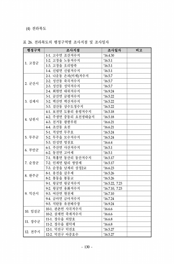 130 4 전라북도 표 26. 전라북도의 행정구역별 조사지점 및 조사일자 행정구역 조사지점 조사일자 비고 1. 고창군 1-1. 고수면 조산저수지 ‘16.4.30 1-2. 고창읍 노동저수지 ‘16.5.1 1-3. 고창읍 오리방죽 ‘16.5.1 1-4. 신림면 신림저수지 ‘16.5.1 2. 군산시 2-1. 나운동 은파 미제 저수지 ‘16.5.7 2-2. 성산동 죽곡저수지 ‘16.5.7 2-3. 성산동 성덕저수지 ‘16.5.7 2-4. 회현면 대위저수지 ‘16.9.24 3. 김제시 3-1. 금산면 금평저수지 ‘16.5.22 3-2. 백산면 백산저수지 ‘16.5.22 3-3. 검산동 상수도정수지 ‘16.5.22 4. 남원시 4-1. 보전면 도룡리 용평저수지 ‘16.5.18 4-2. 주생면 중동리 요천생태습지 ‘16...