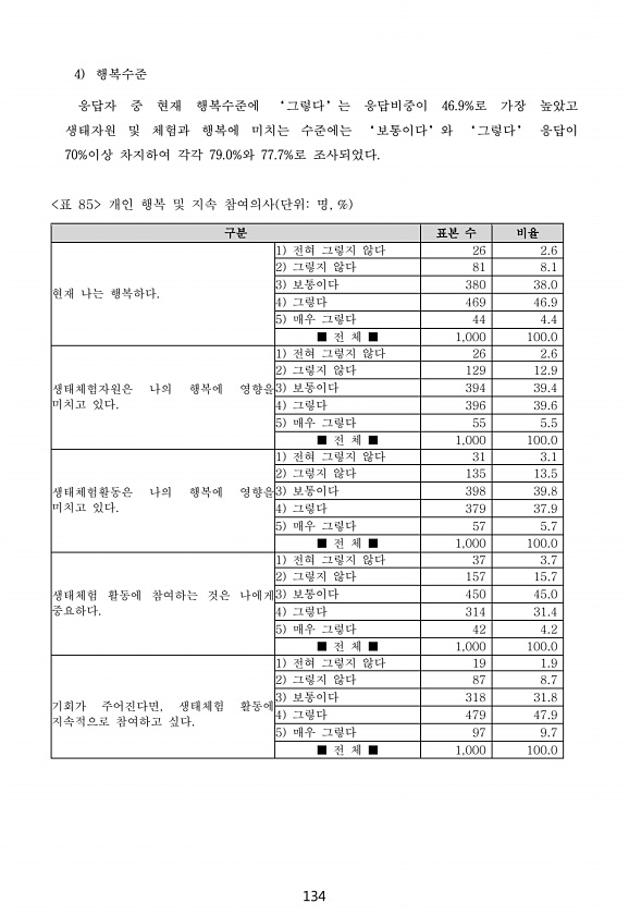 134 4 행복수준 응답자 중 현재 행복수준에 ‘그렇다’는 응답비중이 46.9%로 가장 높았고 생태자원 및 체험과 행복에 미치는 수준에는 ‘보통이다’와 ‘그렇다’ 응답이 70%이상 차지하여 각각 79.0%와 77.7%로 조사되었다. 표 85 개인 행복 및 지속 참여의사 단위명, % 구분 표본 수 비율 현재 나는 행복하다. 1 전혀 그렇지 않다 26 2.6 2 그렇지 않다 81 8.1 3 보통이다 380 38.0 4 그렇다 469 46.9 5 매우 그렇다 44 4.4 ■ 전 체 ■ 1,000 100.0 생태체험자원은 나의 행복에 영향을 미치고 있다. 1 전혀 그렇지 않다 26 2.6 2 그렇지 않다 129 12.9 3 보통이다 394 39.4 4 그렇다 396 39.6 5 매우 그렇다 55 5.5 ■ 전 체 ...