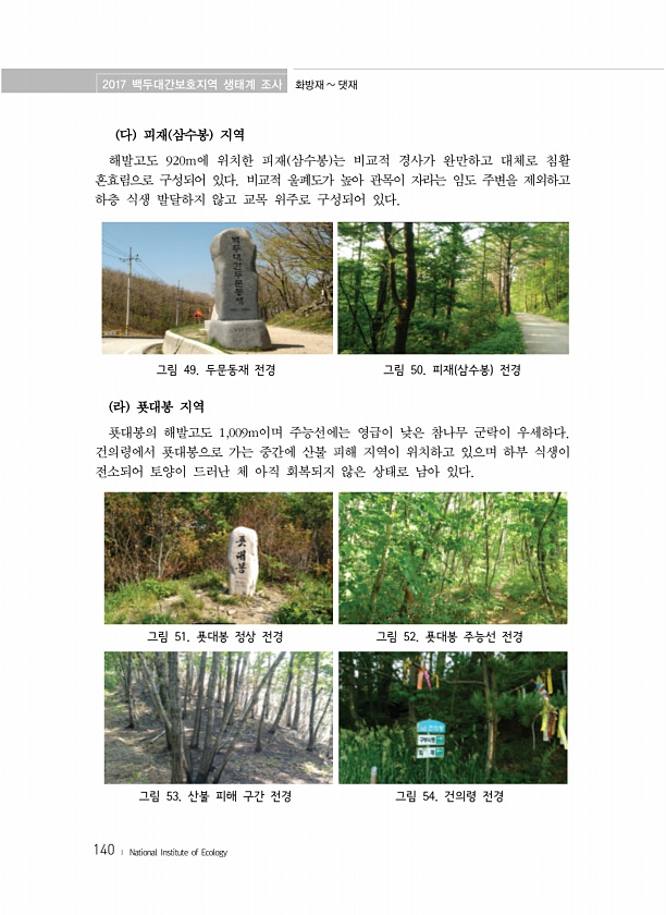 2017 백두대간보호지역 생태계 조사 화방재 댓재 140 ? National Institute of Ecology 다 피재 삼수봉 지역 해발고도 920m에 위치한 피재 삼수봉 는 비교적 경사가 완만하고 대체로 침활 혼효림으로 구성되어 있다. 비교적 울폐도가 높아 관목이 자라는 임도 주변을 제외하고 하층 식생 발달하지 않고 교목 위주로 구성되어 있다. 그림 49. 두문동재 전경 그림 50. 피재 삼수봉 전경 라 푯대봉 지역 푯대봉의 해발고도 1,009m이며 주능선에는 영급이 낮은 참나무 군락이 우세하다. 건의령에서 푯대봉으로 가는 중간에 산불 피해 지역이 위치하고 있으며 하부 식생이 전소되어 토양이 드러난 체 아직 회복되지 않은 상태로 남아 있다. 그림 51. 푯대봉 정상 전경 그림 52. 푯대봉 주능선 전경...