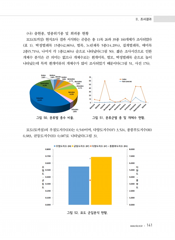 Ⅱ. 조사결과 www.nie.re.kr ? 141 나 출현종, 멸종위기종 및 희귀종 현황 묘도 토끼섬 현지조사 결과 서식하는 곤충은 총 11목 26과 35종 160개체가 조사되었다 표 1 딱정벌레목 15종 42.86% , 벌목, 노린재목 5종 14.29% , 집게벌레목, 매미목 2종 5.71% , 나머지 각 1종 2.86% 순으로 나타났다 그림 50 짧은 조사시간으로 인한 개체수 분석은 큰 의미는 없으나 개체수로는 흰개미목, 벌모, 딱정벌레목 순으로 높이 나타났는데 특히 흰개미류의 개체수가 많이 조사되었기 때문이다 그림 51, 사진 176 그림 50. 분류별 종수 비율. 그림 51. 분류군별 종 및 개체수 현황. 묘도 토끼섬 의 우점도지수 DI 는 0.549이며, 다양도지수 H3.524, 종풍부도지수 RI ...