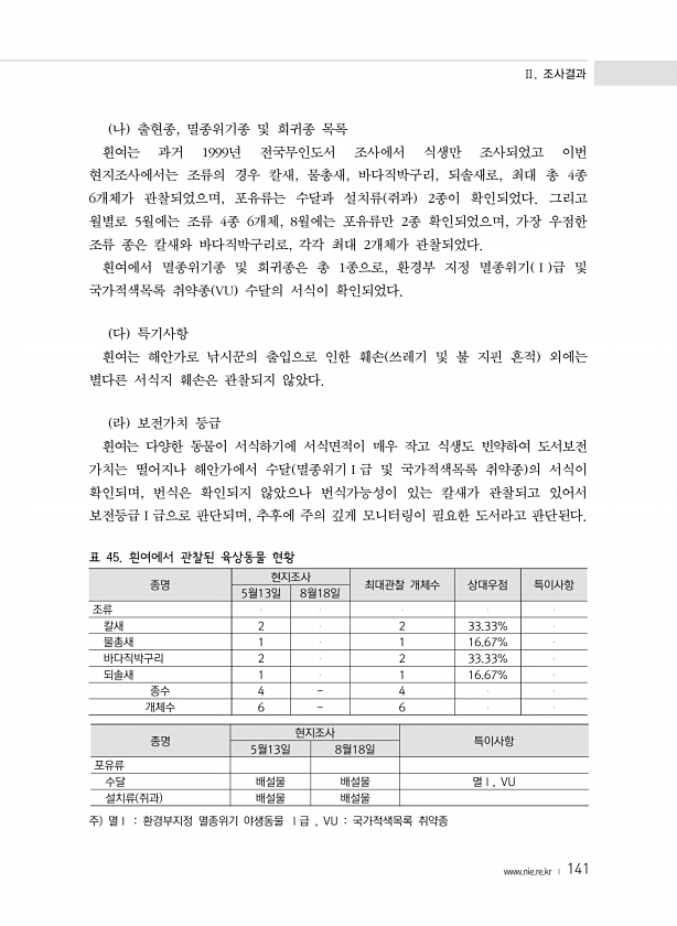 Ⅱ. 조사결과 www.nie.re.kr ? 141 나 출현종, 멸종위기종 및 희귀종 목록 흰여는 과거 1999년 전국무인도서 조사에서 식생만 조사되었고 이번 현지조사에서는 조류의 경우 칼새, 물총새, 바다직박구리, 되솔새로, 최대 총 4종 6개체가 관찰되었으며, 포유류는 수달과 설치류 쥐과 2종이 확인되었다. 그리고 월별로 5월에는 조류 4종 6개체, 8월에는 포유류만 2종 확인되었으며, 가장 우점한 조류 종은 칼새와 바다직박구리로, 각각 최대 2개체가 관찰되었다. 흰여에서 멸종위기종 및 희귀종은 총 1종으로, 환경부 지정 멸종위기 Ⅰ 급 및 국가적색목록 취약종 VU 수달의 서식이 확인되었다. 다 특기사항 흰여는 해안가로 낚시꾼의 출입으로 인한 훼손 쓰레기 및 불 지핀 흔적 외에는 별다른 서식지 훼손은 관찰...