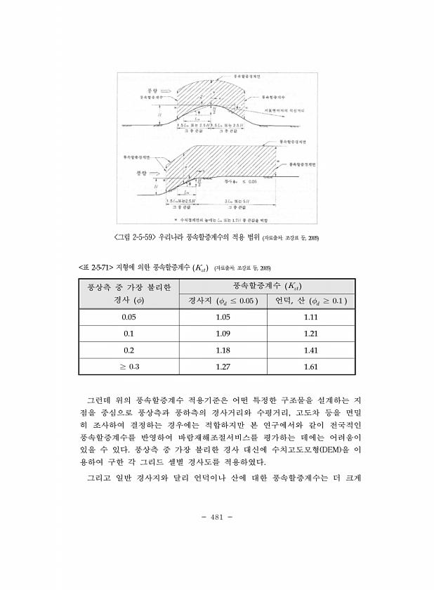 481 그림 2-5-59 우리나라 풍속할증계수의 적용 범위 자료출처조강표 등, 2005 풍상측 중 가장 불리한 경사 풍속할증계수 ?? 경사지 ? ≤ 언덕, 산 ? ≥ 0.05 1.05 1.11 0.1 1.09 1.21 0.2 1.18 1.41 ≥ 1.27 1.61 표 2-5-71 지형에 의한 풍속할증계수 ?? 자료출처조강표 등, 2005 그런데 위의 풍속할증계수 적용기준은 어떤 특정한 구조물을 설계하는 지 점을 중심으로 풍상측과 풍하측의 경사거리와 수평거리, 고도차 등을 면밀 히 조사하여 결정하는 경우에는 적합하지만 본 연구에서와 같이 전국적인 풍속할증계수를 반영하여 바람재해조절서비스를 평가하는 데에는 어려움이 있을 수 있다. 풍상측 중 가장 불리한 경사 대신에 수치고도모형...