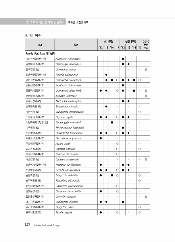 2017 백두대간 생태계 정밀조사 구룡산 고정조사구 142 ? National Institute of Ecology 표 53. 계속 국명 학명 소나무림 신갈나무림 2010 문헌 ‘12 ‘13 ‘14 ‘17 ‘12 ‘13 ‘14 ‘17 조사 Family Pyralidae 명나방과 가는흰띠알락명나방 Acrobasis rufilimbalis ● 갈색띠비단명나방 Orthopygia nannodes ● ◆ 갈색집명나방 Orthaga achatina ◎ 검은쌍줄알락명나방 Faveria bilineatella ◆ 검은점뾰족명나방 Endotricha olivacealis ◆ ■ ○ ● ◆ ■ ○ 검은점알락...