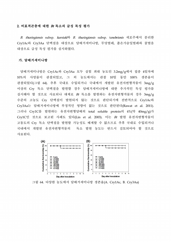 2. 비표적곤충에 대한 Bt 독소의 급성 독성 평가 B. thuringiensis subsp. kurstaki와 B. thuringiensis subsp. tenebrionis 세포주에서 분리한 Cry1Ac와 Cry3Aa 단백질을 대상으로 담배거세미나방, 무당벌레, 좁은가슴잎벌레와 꿀벌을 대상으로 급성 독성 평가를 실시하였다. 가. 담배거세미나방 담배거세미나방은 Cry1Ac와 Cry3Aa 모두 실험 최대 농도인 3.2mg/g에서 접종 4일차에 10%의 사망률이 관찰되었고, 그 외 농도에서는 관찰 10일 동안 100% 생존율이 관찰되었다 그림 64 추후 국내로 수입되거나 국내에서 개발된 유전자변형작물이 3mg/g 이상의 Cry 독소 단백질을 발현할 경우 담배거세미나방에 대한 추가적인 독성 평가를 실시해야 할 ...