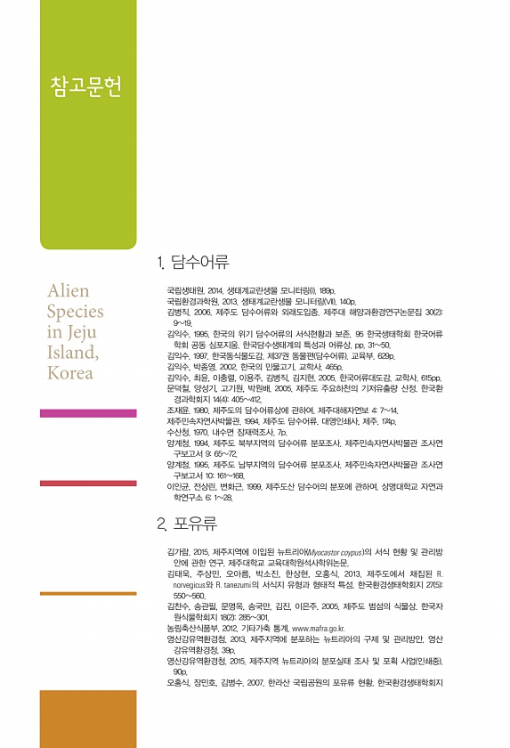 1. 담수어류 국립생태원. 2014. 생태계교란생물 모니터링 I 189p. 국립환경과학원. 2013. 생태계교란생물 모니터링 VII 140p. 김병직. 2006. 제주도 담수어류와 외래도입종. 제주대 해양과환경연구논문집 30 2 919. 김익수. 1995. 한국의 위기 담수어류의 서식현황과 보존. 95 한국생태학회 한국어류 학회 공동 심포지움. 한국담수생태계의 특성과 어류상. pp. 3150. 김익수. 1997. 한국동식물도감. 제37권 동물편 담수어류 교육부. 629p. 김익수, 박종영. 2002. 한국의 민물고기. 교학사. 465p. 김익수, 최윤, 이충렬, 이용주, 김병직, 김지현. 2005. 한국어류대도감. 교학사. 615pp. 문덕철, 양성기, 고기원, 박원배. 2005. 제주도 주요하천의 기저유출...