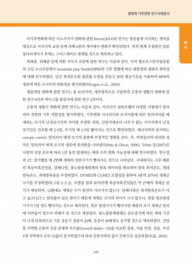 147 생태계 기후변화 연구사례분석 곤 충 미기후변화에 따른 미소서식지 변화에 관한 Kwon 2014 의 연구는 광릉숲에 서식하는 개미를 대상으로 서식지의 교란 등에 의해 6종의 개미에서 변화가 확인되었다. 특히 현재 우점종인 일본 장다리개미가 후에는 스미스개미로 대체될 것으로 예측하고 있다. 외래종, 위해종 등에 의한 서식지 교란에 관한 연구는 다음과 같다. 미국 엘로우스톤국립공원 의 고산 소나무림에서 mountain pine beetle MPB 의 기후 영향에 따른 대발생과 생태적 취약성 에 대해 연구하였다. 년간 최저온도와 생존률 모델을 만들고 30년 평균기온을 이용하여 MPB의 생존에 따른 소나무의 위험성을 평가하였다 Logan et al., 2010 생물계절 변화에 관한 연구는 총 10건이며, 세부...