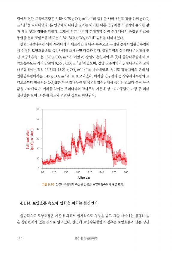 150 국가장기생태연구 림에서 연간 토양호흡량은 6.489.78 g CO2 m-2 d-1의 범위를 나타내었고 평균 7.69 g CO2 m-2 d-1을 나타내었다. 본 연구에서 나타난 결과는 이러한 다른 연구자들의 결과와 유사한 값 과 계절 변화 경향을 따랐다. 그밖에 다른 나라의 온대지역 삼림 생태계에서 측정된 자료를 종합한 결과 토양호흡 속도는 0.2424.0 g CO2 m-2 d-1범위를 나타내었다. 한편, 신갈나무림 외에 우리나라의 대표적인 참나무 수종으로 구성된 온대낙엽활엽수림에 서 수행된 토양호흡속도 측정사례를 소개하면 다음과 같다. 충남지역의 상수리나무림에서 연 간 토양호흡속도는 18.8 g CO2 m-2 d-1이었고, 강원도 춘천지역 두 곳의 굴참나무림에서 토 양호흡속도는 각각 8.90와 9.5...