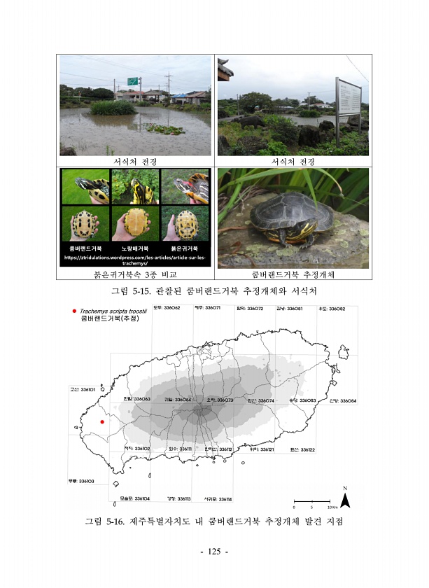 125 서식처 전경 서식처 전경 붉은귀거북속 3종 비교 쿰버랜드거북 추정개체 그림 5-15. 관찰된 쿰버랜드거북 추정개체와 서식처 그림 5-16. 제주특별자치도 내 쿰버랜드거북 추정개체 발견지점