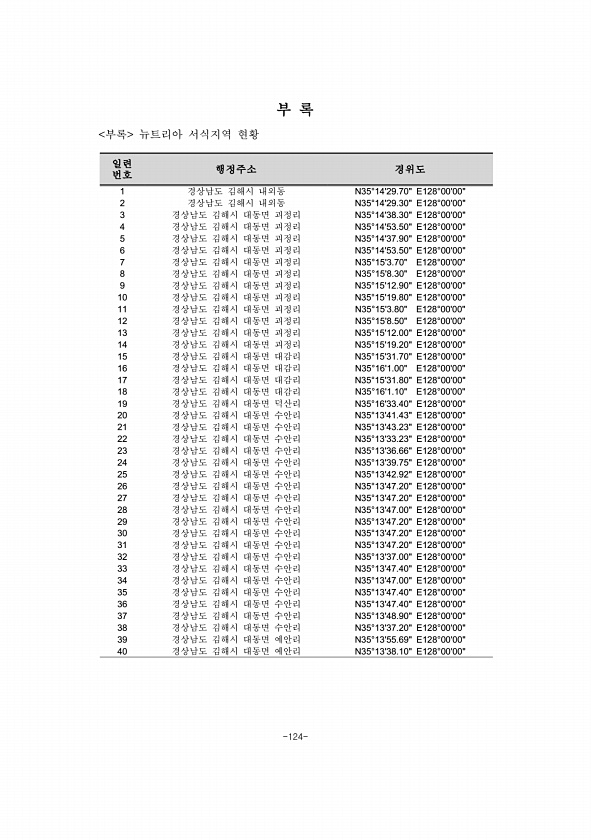 -124- 부 록 부록 뉴트리아 서식지역 현황 일련 번호 행정주소 경위도 1 경상남도 김해시 내외동 N35°1429.70E128°00002 경상남도 김해시 내외동 N35°1429.30E128°00003 경상남도 김해시 대동면 괴정리 N35°1438.30E128°00004 경상남도 김해시 대동면 괴정리 N35°1453.50E128°00005 경상남도 김해시 대동면 괴정리 N35°1437.90E128°00006 경상남도 김해시 대동면 괴정리 N35°1453.50E128°00007 경상남도 김해시 대동면 괴정리 N35°153.70E128°00008 경상남도 김해시 대동면 괴정리 N35°158.30E128°00009 경상남도 김해시 대동면 괴정리 N35°1512.90E128°000010 경상남도 김해시 대동면 괴정...