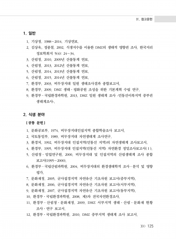 Ⅳ. 참고문헌 125 1. 일반 1. 기상청. 1988∼2014. 기상연보. 2. 김상욱, 정종철. 2002. 식생지수를 이용한 DMZ의 생태적 영향권 조사. 한국지리 정보학회지 5 4 24∼34. 3. 산림청. 2010. 2009년 산불통계 연보. 4. 산림청. 2013. 2012년 산불통계 연보. 5. 산림청. 2014. 2013년 산불통계 연보. 6. 산림청. 2015. 2014년 산불통계 연보. 7. 환경부. 2003. 비무장지대 일원 생태조사결과 종합보고서. 8. 환경부. 2009. DMZ 생태·평화공원 조성을 위한 기본계획 수립 연구. 9. 환경부·국립환경과학원. 2013. DMZ 일원 생태계 조사 -민통선이북지역 중부권 생태계조사-. 2. 식생 분야 [ 공통 문헌 ] 1. 문화공보부. 1974....