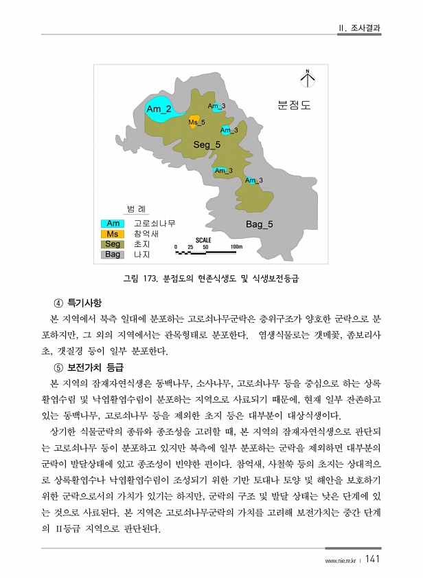 Ⅱ. 조사결과 www.nie.re.kr ? 141 그림 173. 분점도의 현존식생도 및 식생보전등급 ④ 특기사항 본 지역에서 북측 일대에 분포하는 고로쇠나무군락은 층위구조가 양호한 군락으로 분 포하지만, 그 외의 지역에서는 관목형태로 분포한다. 염생식물로는 갯메꽃, 좀보리사 초, 갯질경 등이 일부 분포한다. ⑤ 보전가치 등급 본 지역의 잠재자연식생은 동백나무, 소사나무, 고로쇠나무 등을 중심으로 하는 상록 활엽수림 및 낙엽활엽수림이 분포하는 지역으로 사료되기 때문에, 현재 일부 잔존하고 있는 동백나무, 고로쇠나무 등을 제외한 초지 등은 대부분이 대상식생이다. 상기한 식물군락의 종류와 종조성을 고려할 때, 본 지역의 잠재자연식생으로 판단되 는 고로쇠나무 등이 분포하고 있지만 북측에 일부 분포하는 군락을 제외하...
