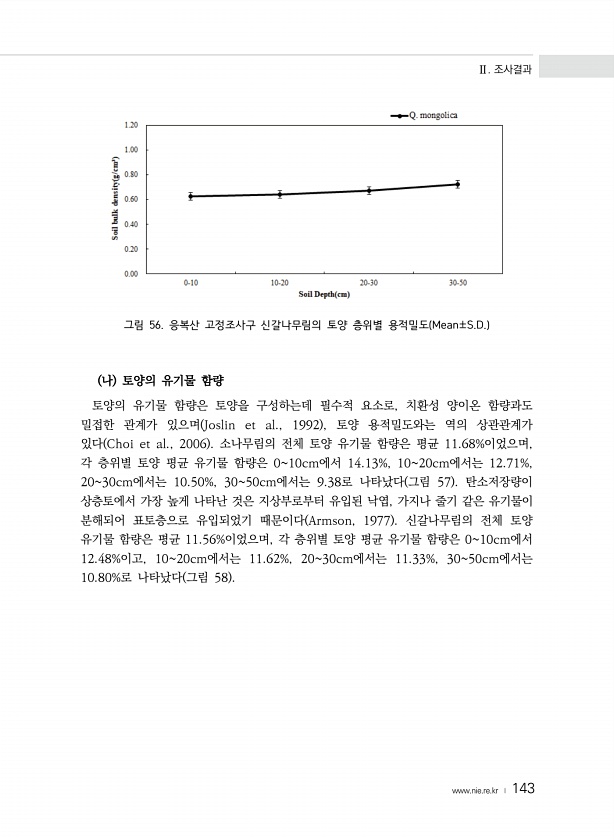 Ⅱ. 조사결과 www.nie.re.kr ? 143 그림 56. 응복산 고정조사구 신갈나무림의 토양 층위별 용적밀도 Mean±S.D. 나 토양의 유기물 함량 토양의 유기물 함량은 토양을 구성하는데 필수적 요소로, 치환성 양이온 함량과도 밀접한 관계가 있으며 Joslin et al., 1992 , 토양 용적밀도와는 역의 상관관계가 있다 Choi et al., 2006 소나무림의 전체 토양 유기물 함량은 평균 11.68%이었으며, 각 층위별 토양 평균 유기물 함량은 010cm에서 14.13%, 1020cm에서는 12.71%, 2030cm에서는 10.50%, 3050cm에서는 9.38로 나타났다 그림 57 탄소저장량이 상층토에서 가장 높게 나타난 것은 지상부로부터 유입된 낙엽, 가지나 줄기 같은 유기물이 분해되어 ...