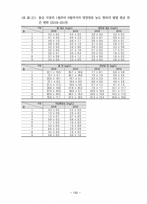 123 구분 월 총 질소 mg/L 질산성 질소 mg/L 2018 2019 2018 2019 1 3.2 ± 0.4 4.3 ± 0.2 2.8 ± 0.3 3.2 ± 0.2 2 4.1 ± 0.5 6.4 ± 2.3 3.3 ± 0.1 5.0 ± 2.2 3 4.9 ± 1.0 4.6 ± 1.1 3.6 ± 0.4 3.3 ± 0.1 4 3.8 ± 0.6 5.3 ± 1.3 3.1 ± 0.2 2.9 ± 0.7 5 3.2 ± 0.3 2.9 ± 0.6 2.6 ± 0.3 2.3 ± 0.6 6 3.2 ± 0.4 3.7 ± 1.8 2.1 ± 0.2 1.7 ± 0.1 7 3.6 ± 0.1 3.0 ± 0.4 2.9 ± 0.3 1.8 ± 0.2 8 3.7 ± 0.6 2.9 ± 1.2 2.5 ± 0.6 1.6 ± 0.2 9 3.3 ± 0.4 2...
