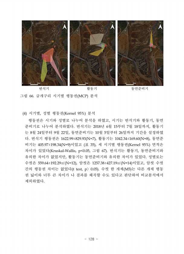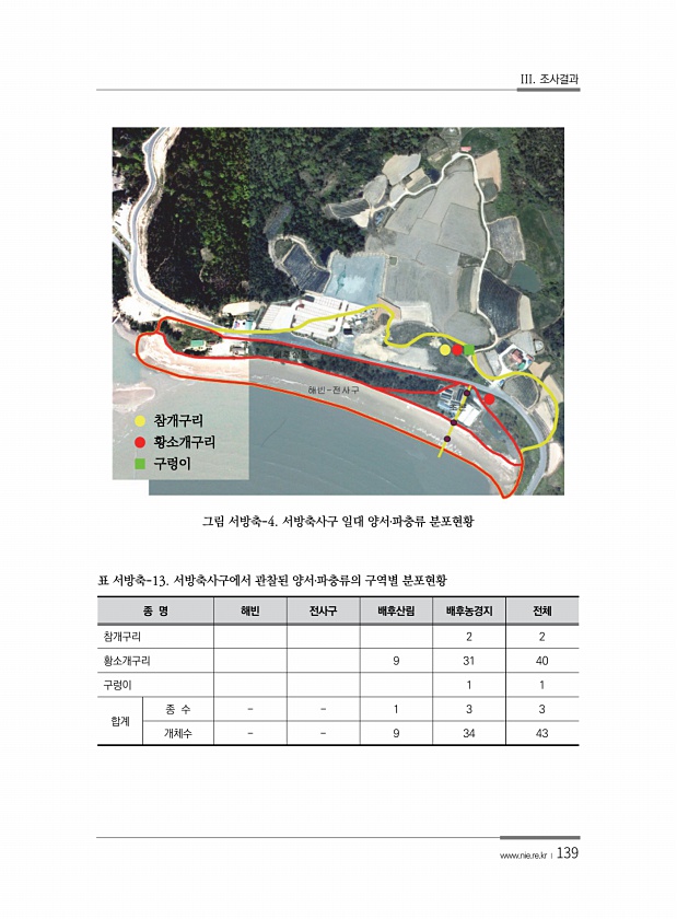 III. 조사결과 www.nie.re.kr ?139 ● 참개구리 ● 황소개구리 ■ 구렁이 ●●■ ● 그림 서방축-4. 서방축사구 일대 양서?파충류 분포현황 종 명 해빈 전사구 배후산림 배후농경지 전체 참개구리 2 2 황소개구리 9 31 40 구렁이 1 1 합계 종 수 1 3 3 개체수 9 34 43 표 서방축-13. 서방축사구에서 관찰된 양서?파충류의 구역별분포현황
