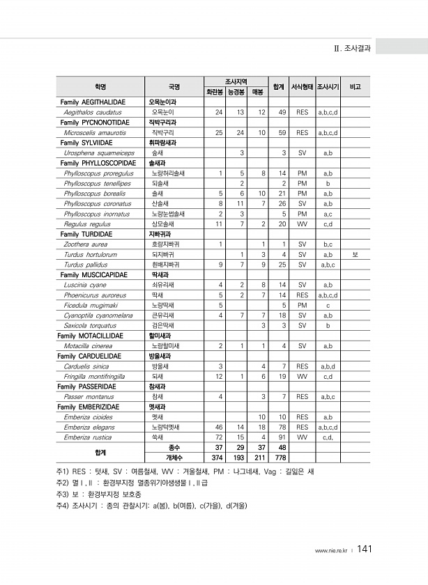 Ⅱ. 조사결과 www.nie.re.kr ? 141 학명 국명 조사지역 합계 서식형태 조사시기 비고 화란봉 능경봉 매봉 Family AEGITHALIDAE 오목눈이과 Aegithalos caudatus 오목눈이 24 13 12 49 RES a,b,c,d Family PYCNONOTIDAE 직박구리과 Microscelis amaurotis 직박구리 25 24 10 59 RES a,b,c,d Family SYLVIIDAE 휘파람새과 Urosphena squameiceps 숲새 3 3 SV a,b Family PHYLLOSCOPIDAE 솔새과 Phylloscopus proregulus 노랑허리솔새 1 5 8 14 PM a,b Phylloscopus tenellipes 되솔새 2 2 PM b Phylloscopus ...
