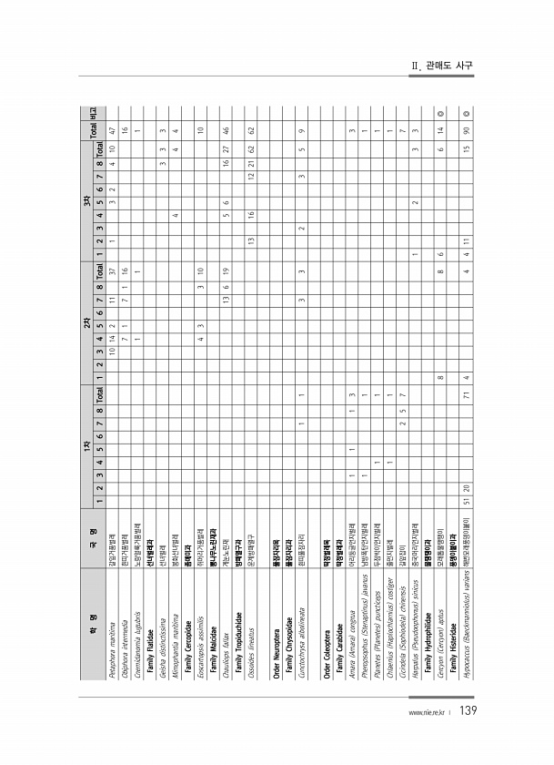 139 학 명 국 명 1차 2차 3차 Total 비고 1 2 3 4 5 6 7 8 Total 1 2 3 4 5 6 7 8 Total 1 2 3 4 5 6 7 8 Total Petaphora maritima 갈잎거품벌레 10 14 2 11 37 1 3 2 4 10 47 Obiphora intermedia 흰띠거품벌레 7 1 7 1 16 16 Cnemidanomia lugubris 노랑얼룩거품벌레 1 1 1 Family Flatidae 선녀벌레과 Geisha distinctissima 선녀벌레 3 3 3 Mimophantia maritima 봉화선녀벌레 4 4 4 Family Cercopidae 좀매미과 Eoscartopsis assimilis 쥐머리거품벌레 4 3 3 10 10 Family Malcidae 뽕...