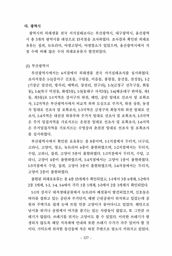 다. 광역시 광역시의 외래생물 전국 서식실태조사는 부산광역시, 대구광역시, 울산광역 시 총 3개의 광역시를 대상으로 15지점을 조사하였다. 조사결과 확인된 외래포 유류는 집쥐, 뉴트리아, 야생고양이, 야생염소가 있었으며, 울산광역시에서 지 점 수에 비해 많은 수의 외래포유류가 발견되었다. 1 부산광역시 부산광역시에서는 6지점에서 외래생물 전국 서식실태조사를 실시하였다. 조사지점은 1-1 강서구 신호동, 구랑동, 미음동, 봉림동, 동선동, 천성동 , 1-2 기장군 달산리, 방곡리, 매학리, 장전리, 연구리 , 1-3 금정구 선두구동, 회동 동 , 1-4 북구 덕천동, 화명3동 , 1-5 동래구 사직3동 , 1-6 해운대구 반여동, 좌1 동, 좌3동 로 1-1지역은 강서구의 하천, 해안, 공단 일대로 선조사 및...