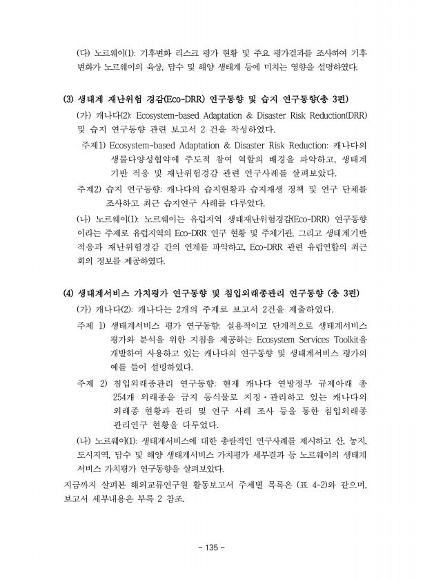 135 다 노르웨이 1 기후변화 리스크 평가 현황 및 주요 평가결과를 조사하여 기후 변화가 노르웨이의 육상, 담수 및 해양 생태계 등에 미치는 영향을 설명하였다. 3 생태계 재난위험 경감 Eco-DRR 연구동향 및 습지 연구동향 총 3편 가 캐나다 2 Ecosystem-based Adaptation & Disaster Risk Reduction DRR 및 습지 연구동향 관련 보고서 2 건을 작성하였다. 주제1 Ecosystem-based Adaptation & Disaster Risk Reduction캐나다의 생물다양성협약에 주도적 참여 역할의 배경을 파악하고, 생태계 기반 적응 및 재난위험경감 관련 연구사례를 살펴보았다. 주제2 습지 연구동향캐나다의 습지현황과 습지재생 정책 및 연구 단체를 조사하고 최근 ...