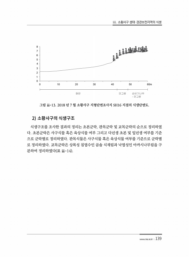 iii. 소황사구 생태·경관보전지역의 식생 www.nie.re.kr ?139 그림 ⅲ-13. 2018 년 7 월 소황사구 지형단면조사지 SH16 지점의 식생단면도. 2 식생구조를 조사한 결과의 정리는 초본군락, 관목군락 및 교목군락의 순으로 정리하였 다. 초본군락은 사구식물 혹은 육상식물 여부 그리고 다년생 초본 및 일년생 여부를 기준 으로 군락별로 정리하였다. 관목식물은 사구식물 혹은 육상식물 여부를 기준으로 군락별 로 정리하였다. 교목군락은 상록성 침엽수인 곰솔 식재림과 낙엽성인 아까시나무림을 구 분하여 정리하였다 표 ⅲ-14