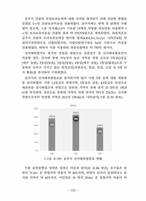 129 공주시 산림의 토양보유능력에 대한 가치를 평가하기 위해 진술한 방법을 토대로 당 토양보유비용을 산출하였다 공주시에는 현재 총 개의 사방 댐이 있으며 그중 저사량 이 기록된 개의 사방댐 자료만을 이용하여 당 토사보유비용을 산출한 결과 약 원으로 책정되었다 최종적으로 공주시 산림의 토사보유능력을 평가한 결과 원 약 칠억구천만원으로 산출되었지만 국립산림연구원은 당 기준으로 비용을 산출하였다 따라서 이를 적용하면 최종산출액은 약 억 원이다 산사태위험지도 전국의 산림을 대상으로 집중강우 등 산사태유발요인이 작용할 경우 산사태 발생 가능성이 높은 지역을 위험 순으로 등급 등급 매우 높음 등급 높음 등급 낮음 등급 매우 낮음 등급 없음 으로 구 분하여 산지가 가지고 있는 외적요인 사면경사 임상 토질 모암 등 개 ...