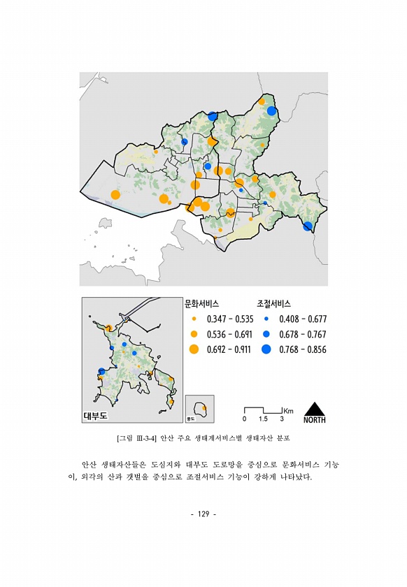 129 [그림 Ⅲ-3-4] 안산 주요 생태계서비스별 생태자산 분포 안산 생태자산들은 도심지와 대부도 도로망을 중심으로 문화서비스 기능 이, 외각의 산과 갯벌을 중심으로 조절서비스 기능이 강하게나타났다.