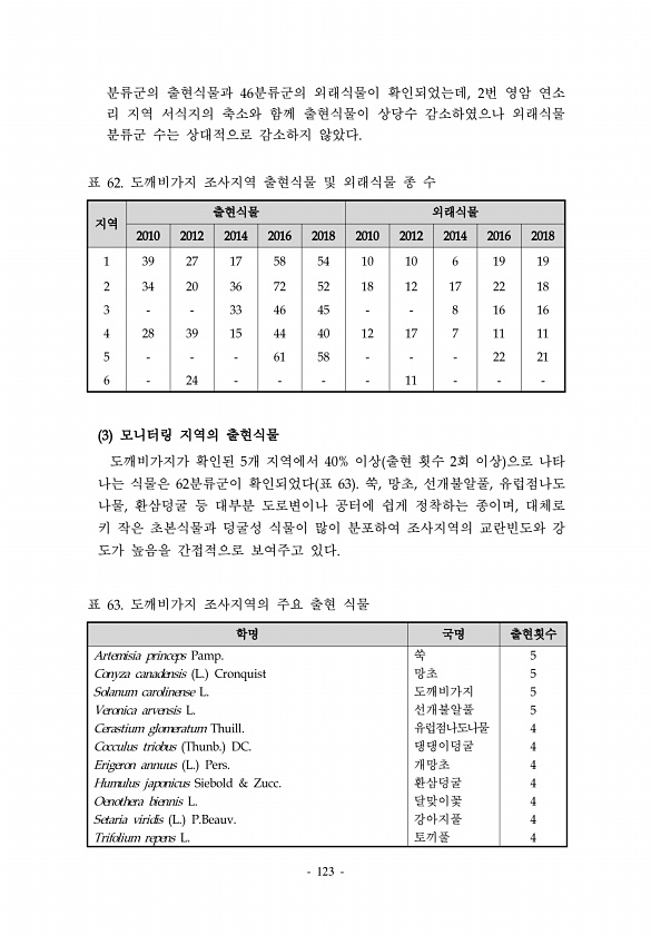 123 분류군의 출현식물과 46분류군의 외래식물이 확인되었는데, 2번 영암 연소 리 지역 서식지의 축소와 함께 출현식물이 상당수 감소하였으나 외래식물 분류군 수는 상대적으로 감소하지 않았다. 지역 출현식물 외래식물 2010 2012 2014 2016 2018 2010 2012 2014 2016 2018 1 39 27 17 58 54 10 10 6 19 19 2 34 20 36 72 52 18 12 17 22 18 3 33 46 45 8 16 16 4 28 39 15 44 40 12 17 7 11 11 5 61 58 22 21 6 24 11 표 62. 도깨비가지 조사지역 출현식물 및 외래식물 종 수 3 모니터링 지역의 출현식물 도깨비가지가 확인된 5개 지역에서 40% 이상 출현 횟수 2회 이상 으로 나타 나는...