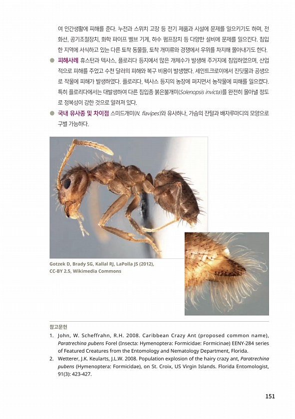 151 여 인간생활에 피해를 준다. 누전과 스위치 고장 등 전기 제품과 시설에 문제를 일으키기도 하며, 전 화선, 공기조절장치, 화학 파이프 벨브 기계, 하수 펌프장치 등 다양한 설비에 문제를 일으킨다. 침입 한 지역에 서식하고 있는 다른 토착 동물들, 토착 개미류와 경쟁에서 우위를 차지해 몰아내기도 한다. ● 피해사례 휴스턴과 텍사스, 플로리다 등지에서 많은 개체수가 발생해 주거지에 침입하였으며, 산업 적으로 피해를 주었고 수천 달러의 피해와 복구 비용이 발생했다. 세인트크로이에서 진딧물과 공생으 로 작물에 피해가 발생하였다. 플로리다, 텍사스 등지의 농장에 퍼지면서 농작물에 피해를 일으켰다. 특히 플로리다에서는 대발생하여 다른 침입종 붉은불개미 Solenopsis invicta 를 완전히 몰아낼 정도 로...