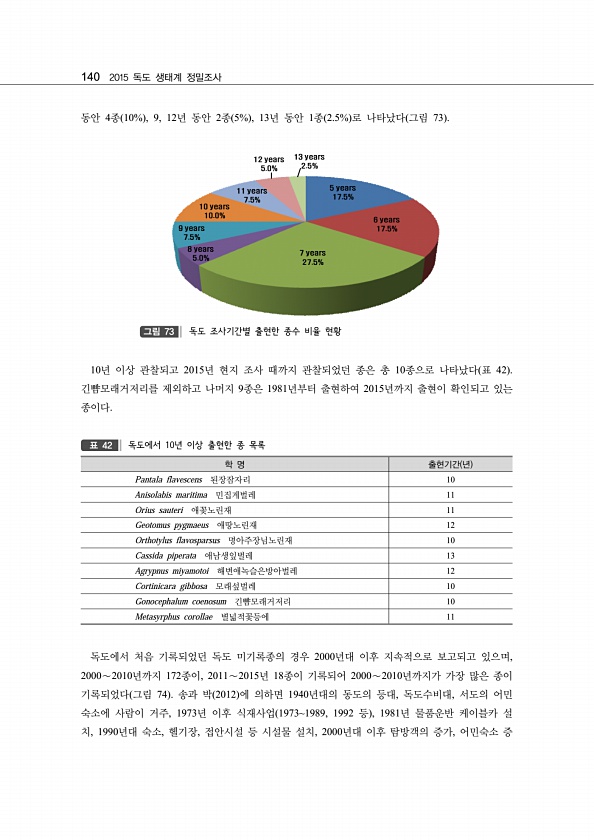 140 2015 독도 생태계 정밀조사 동안 4종 10% , 9, 12년 동안 2종 5% , 13년 동안 1종 2.5% 로 나타났다 그림 73 5 years 17.5% 6 years 17.5% 7 years 27.5% 8 years 5.0% 9 years 7.5% 10 years 10.0% 11 years 7.5% 12 years 5.0% 13 years 2.5% 그림 73 독도 조사기간별 출현한 종수 비율 현황 10년 이상 관찰되고 2015년 현지 조사 때까지 관찰되었던 종은 총 10종으로 나타났다 표 42 긴뺨모래거저리를 제외하고 나머지 9종은 1981년부터 출현하여 2015년까지 출현이 확인되고 있는 종이다. 학 명 출현기간 년 Pantala flavescens 된장잠자리 10 Anisolabis mar...