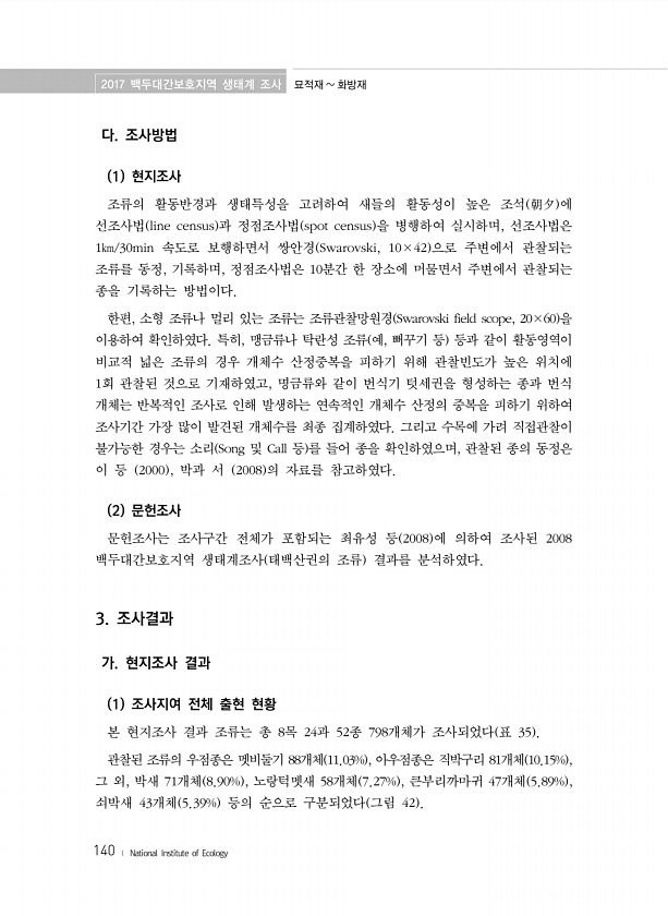2017 백두대간보호지역 생태계 조사 묘적재 화방재 140 ? National Institute of Ecology 다. 조사방법 1 현지조사 조류의 활동반경과 생태특성을 고려하여 새들의 활동성이 높은 조석 朝夕 에 선조사법 line census 과 정점조사법 spot census 을 병행하여 실시하며, 선조사법은 1㎞/30min 속도로 보행하면서 쌍안경 Swarovski, 10×42 으로 주변에서 관찰되는 조류를 동정, 기록하며, 정점조사법은 10분간 한 장소에 머물면서 주변에서 관찰되는 종을 기록하는 방법이다. 한편, 소형 조류나 멀리 있는 조류는 조류관찰망원경 Swarovski field scope, 20×60 을 이용하여 확인하였다. 특히, 맹금류나 탁란성 조류 예, 뻐꾸기 등 등과 같이 활동영역이 ...