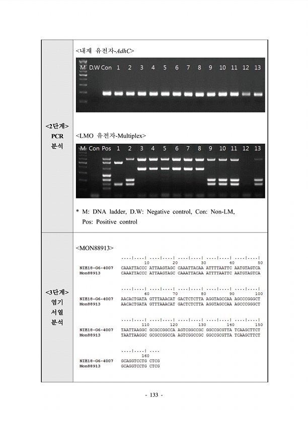 133 2단계 PCR 분석 내재 유전자-AdhC LMO 유전자-Multiplex * MDNA ladder, D.WNegative control, ConNon-LM, PosPositive control 3단계 염기 서열 분석 MON88913
