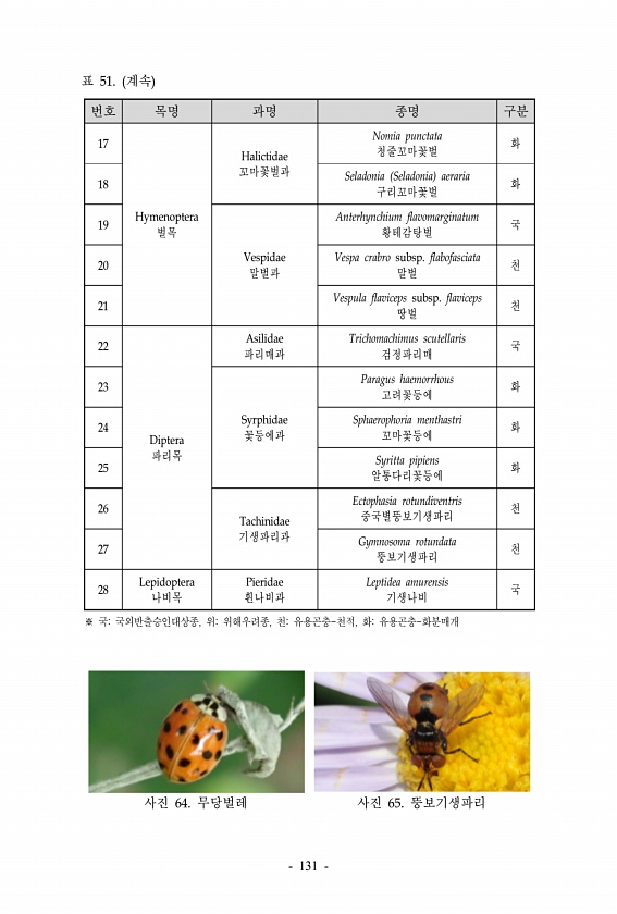 표 51. 계속 번호 목명 과명 종명 구분 17 Hymenoptera 벌목 Halictidae 꼬마꽃벌과 Nomia punctata 청줄꼬마꽃벌 화 18 Seladonia Seladonia aeraria 구리꼬마꽃벌 화 19 Vespidae 말벌과 Anterhynchium flavomarginatum 황테감탕벌 국 20 Vespa crabro subsp. flabofasciata 말벌 천 21 Vespula flaviceps subsp. flaviceps 땅벌 천 22 Diptera 파리목 Asilidae 파리매과 Trichomachimus scutellaris 검정파리매 국 23 Syrphidae 꽃등에과 Paragus haemorrhous 고려꽃등에 화 24 Sphaerophoria menthastri ...