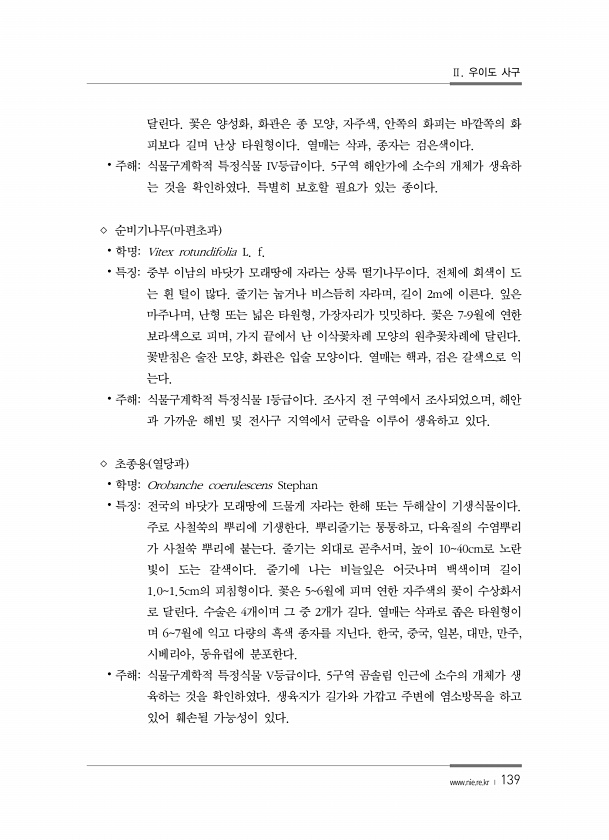 Ⅱ. 우이도 사구 www.nie.re.kr ? 139 달린다. 꽃은 양성화, 화관은 종 모양, 자주색, 안쪽의 화피는 바깥쪽의 화 피보다 길며 난상 타원형이다. 열매는 삭과, 종자는 검은색이다. ?주해식물구계학적 특정식물 IV등급이다. 5구역 해안가에 소수의 개체가 생육하 는 것을 확인하였다. 특별히 보호할 필요가 있는 종이다. ◇ 순비기나무 마편초과 ?학명Vitex rotundifolia L. f. ?특징중부 이남의 바닷가 모래땅에 자라는 상록 떨기나무이다. 전체에 회색이 도 는 흰 털이 많다. 줄기는 눕거나 비스듬히 자라며, 길이 2m에 이른다. 잎은 마주나며, 난형 또는 넓은 타원형, 가장자리가 밋밋하다. 꽃은 7-9월에 연한 보라색으로 피며, 가지 끝에서 난 이삭꽃차례 모양의 원추꽃차례에 달린다. 꽃...