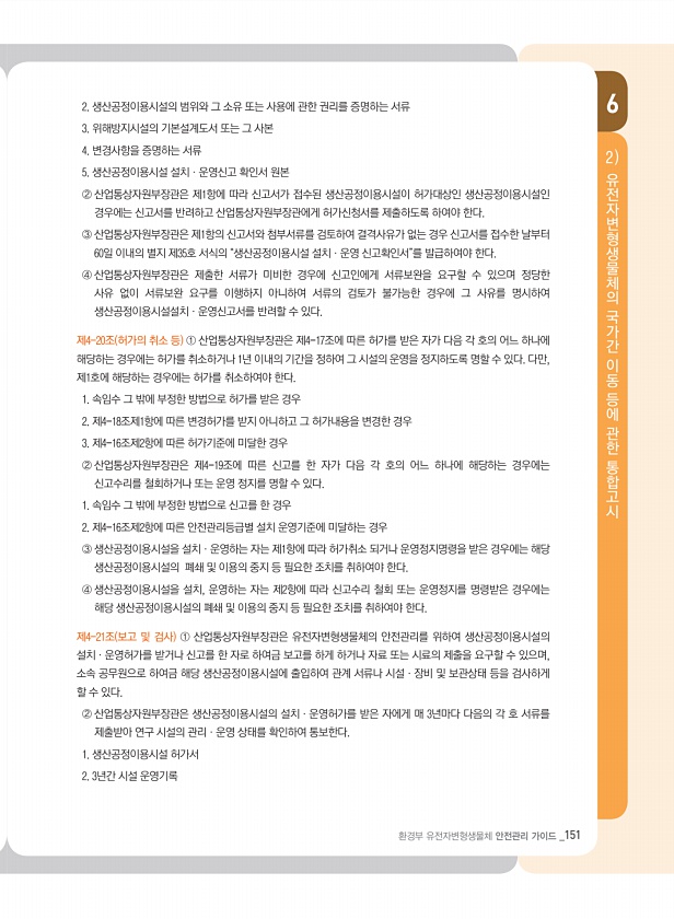 환경부 유전자변형생물체 안전관리 가이드 _151 6 유전자변형생물체의 국가간 이동 등에 관한 통합고시 2 2. 생산공정이용시설의 범위와 그 소유 또는 사용에 관한 권리를 증명하는 서류 3. 위해방지시설의 기본설계도서 또는 그 사본 4. 변경사항을 증명하는 서류 5. 생산공정이용시설 설치·운영신고 확인서 원본 ② 산업통상자원부장관은 제1항에 따라 신고서가 접수된 생산공정이용시설이 허가대상인 생산공정이용시설인 경우에는 신고서를 반려하고 산업통상자원부장관에게 허가신청서를 제출하도록 하여야 한다. ③ 산업통상자원부장관은 제1항의 신고서와 첨부서류를 검토하여 결격사유가 없는 경우 신고서를 접수한 날부터 60일 이내의 별지 제35호 서식의 “생산공정이용시설 설치·운영 신고확인서”를 발급하여야 한다. ④ 산업통상자원부장...
