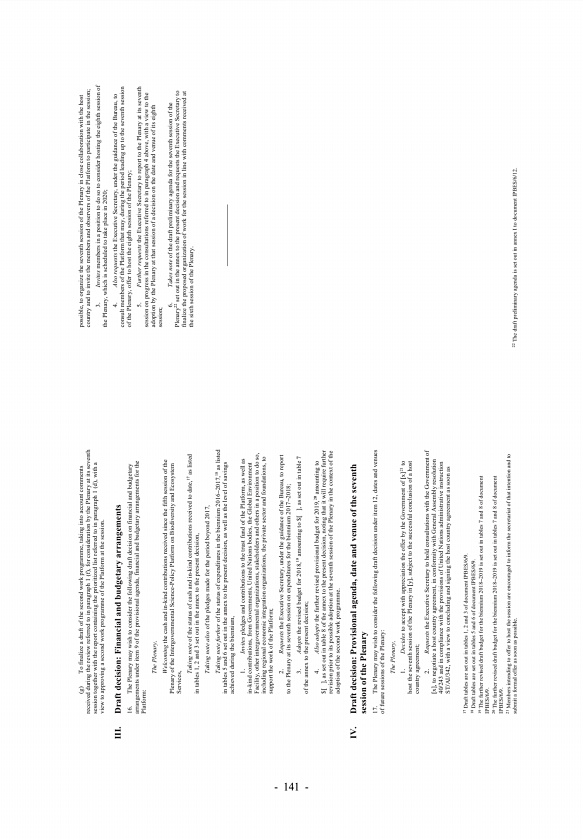 g To finalize a draft of the second work programme, taking into account comments received during the review referred to in paragraph 1 f , for consideration by the Plenary at its seventh session together with the report containing the prioritized list referred to in paragraph 1 d , with a view to approving a second work programme of the Platform at the session. III. Draft decisionFinancial and bud...