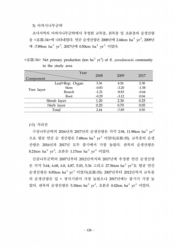 120 3 아까시나무군락 조사지역의 아까시나무군락에서 추정한 교목층, 관목층 및 초본층의 순생산량 을 표Ⅲ-34 에 나타내었다. 연간 순생산량은 2008년에 2.44ton ha-1 yr-1, 2009년 에 -7.89ton ha-1 yr-1, 2017년에 0.50ton ha-1 yr-1 이었다. Year Component 2008 2009 2017 Tree layer Leaf+Rep. Organ 3.36 4.26 2.38 Stem -0.83 -3.20 -1.58 Branch -1.21 -8.83 -0.64 Root -0.29 -3.12 0.04 Shrub layer 1.20 2.30 0.25 Herb layer 0.20 0.70 0.05 Total 2.44 -7.89 0.50 표Ⅲ-34 Net primary ...