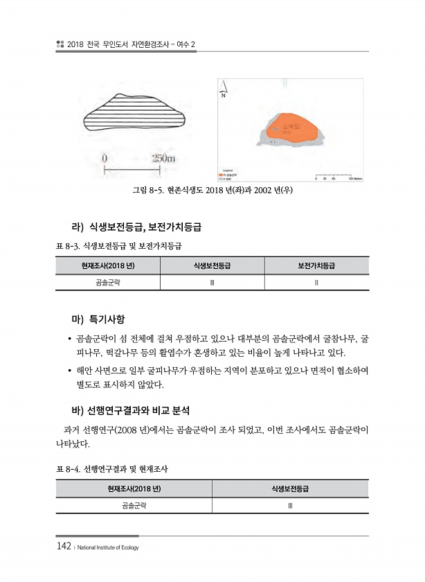 2018 전국 무인도서 자연환경조사 여수 2 142 ? National Institute of Ecology 그림 8-5. 현존식생도 2018 년 좌 과 2002 년 우 , 현재조사 2018 년 식생보전등급 보전가치등급 곰솔군락 Ⅲ Ⅱ 표 8-3. 식생보전등급 및 보전가치등급 ? 곰솔군락이 섬 전체에 걸쳐 우점하고 있으나 대부분의 곰솔군락에서 굴참나무, 굴 피나무, 떡갈나무 등의 활엽수가 혼생하고 있는 비율이 높게 나타나고 있다. ? 해안 사면으로 일부 굴피나무가 우점하는 지역이 분포하고 있으나 면적이 협소하여 별도로 표시하지 않았다. 과거 선행연구 2008 년 에서는 곰솔군락이 조사 되었고, 이번 조사에서도 곰솔군락이 나타났다. 현재조사 2018 년 식생보전등급 곰솔군락 Ⅲ 표 8-4. 선행연구결과 및현재...
