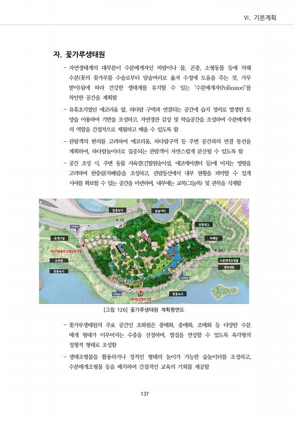 Ⅵ. 기본계획 137 자. 꽃가루생태원 자연생태계의 대부분이 수분매개자인 바람이나 물, 곤충, 소형동물 등에 의해 수분 꽃의 꽃가루를 수술로부터 암술머리로 옮겨 수정에 도움을 주는 것, 가루 받이 됨에 따라 건강한 생태계를 유지할 수 있는 ‘수분매개자 Pollinator ’를 착안한 공간을 계획함 유휴초지였던 에코리움 앞, 하다람 구역과 연결되는 공간에 습지 정비로 발생한 토 양을 이용하여 기반을 조성하고, 자연경관 감상 및 학습공간을 조성하여 수분매개자 의 역할을 간접적으로 체험하고 배울 수 있도록 함 관람객의 편의를 고려하여 에코리움, 하다람구역 등 주변 공간과의 연결 동선을 계획하여, 하다람놀이터로 집중되는 관람객이 자연스럽게 분산될 수 있도록 함 공간 조성 시, 주변 동물 사육장 긴팔원숭이섬, 에코케...